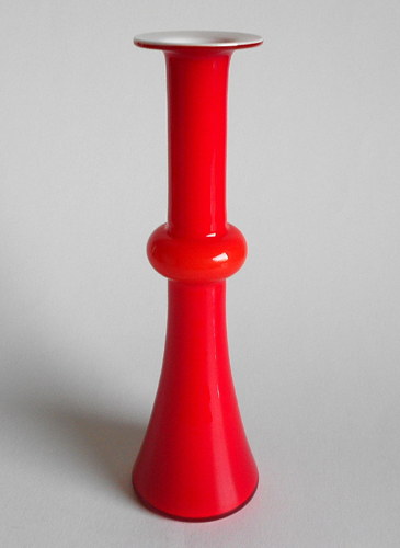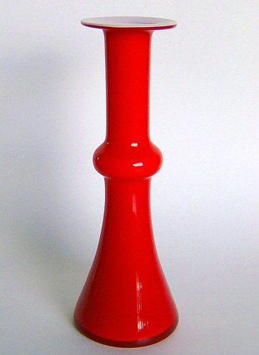 Mellemstor cylindrisk vase fra serien "Carnaby" med flad rand,kugle på midten og trompetformet underdel, i opalhvidt glas med koralrødt overfang.