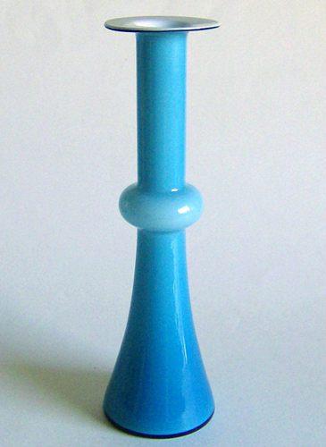Mellemstor cylindrisk vase fra serien "Carnaby" med flad rand,kugle på midten og trompetformet underdel, i opalhvidt glas med oceanblåt overfang.