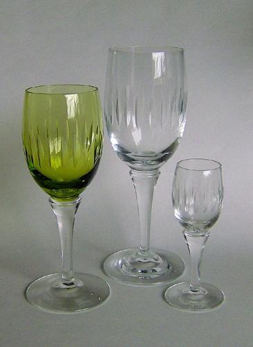 Snapsglas, hvidvinsglas med grøn kumme og rødvinsglas, fra servicet "Leonora"