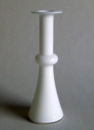 Lille cylindrisk vase fra serien "Carnaby" med flad rand,kugle på midten og trompetformet underdel, i opalhvidt glas med klart overfang.