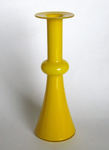 Lille cylindrisk vase fra serien "Carnaby" med flad rand,kugle på midten og trompetformet underdel, blæst i gult opalglas.