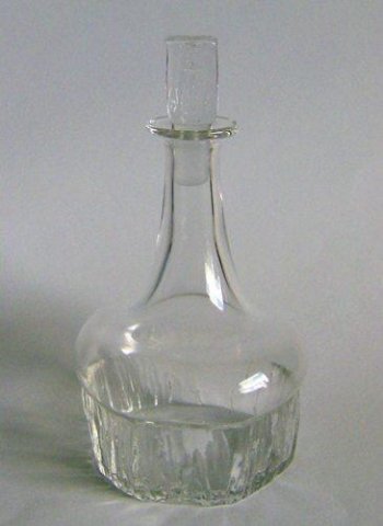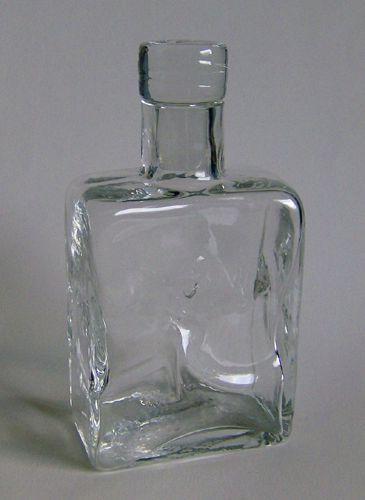 Firkantet karaffel fra serien "Ispol" i klart krystal, med lille hals og tilhørende cylindrisk prop. Nederste halvdel optisk mønstret så det ligner is.