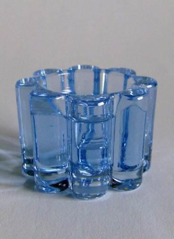 Rund akvablå lysestage fra serien "Arcade" med opstukket bund, kanten består af otte runde søjler. Under bunden "MADE IN DENMARK" i relief.