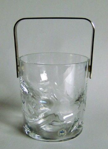 Cylindrisk isspand fra serien "Ispol" i klart krystalglas, nederste halvdel optisk mønstret så det ligner is. Monteret med hank af rustfrit stål.