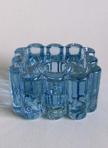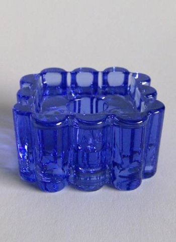 Lille massiv firkantet lysestage fra serien "Isflamme" med hul til lys i toppen, i 24% krystal med mønster der ligner is på alle sider, undtaget bagsiden. Fire små ben i bunden.