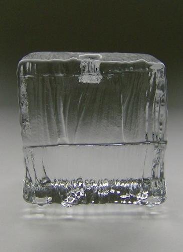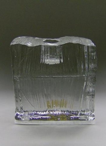 Kraftig massiv firkantet lysestage fra serien "Isflamme" med hul til lys i toppen, i 24% krystal med mønster der ligner is på alle sider, undtaget bagsiden. Fire små ben i bunden.