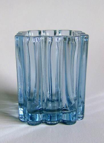 Firkantet akvablå vase fra serien "Arcade" med flad bund, hvor siderne består af tre runde søjler. Under bunden "MADE IN DENMARK" i relief.