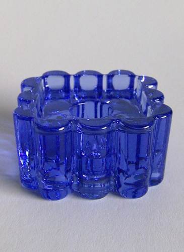 Firkantet akvablå lysestage fra serien "Arcade" med opstukket bund, hvor siderne består af tre runde søjler. Under bunden "MADE IN DENMARK" i relief.