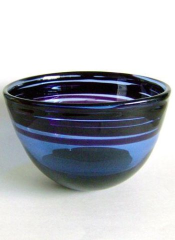 Konisk skål med fortykket rand, blæst i svagt blåt glas med indlagte mørkviolette vandrette striber og massivt sortviolet bundparti. Kuglet i bund.