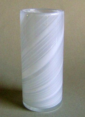 Cylindrisk "Misty" unika vase med afrundet bund, blæst i klart krystalglas med indlagte spiralstriber af hvidt opalglas. Kuglet i bund.