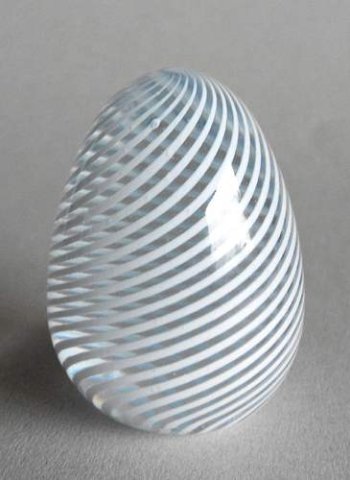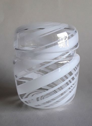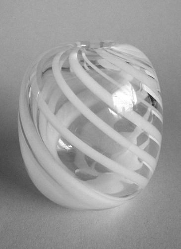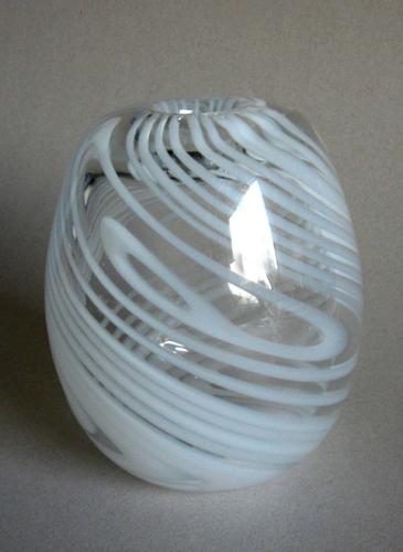 Ægformet unika vase med lille åbning, blæst i klart krystal med indlagte vredne striber af hvidt opalglas. Kuglet i bund.