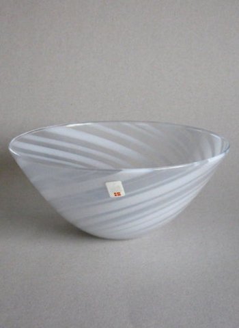 Mellemstor skål fra serien "Misty" blæst i stribet vredet opalglas med overfang af klart krystalglas. Påsat label med nr. 91