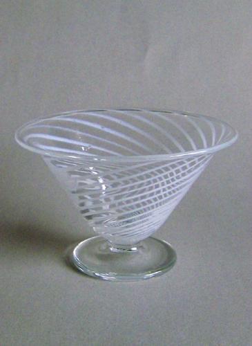 Bred kræmmerhusformet skål på flad fod, blæst i klart glas med indlagte opalhvide striber der er vredet.