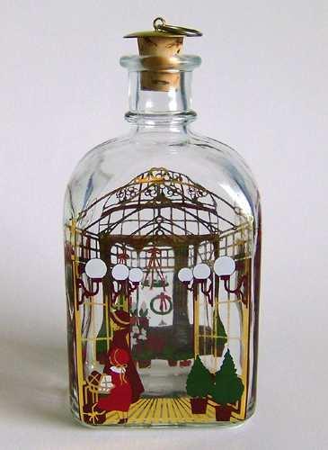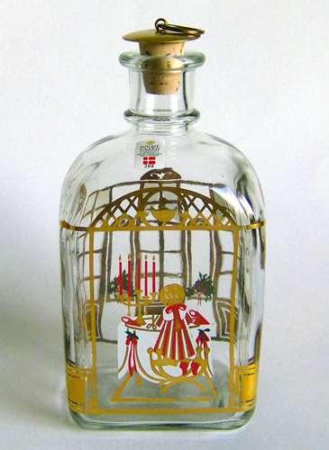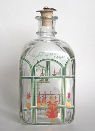 Firkantet karaffel med buet top, lille hals med tilhørende korkprop. Dekoreret med flerfarvet silketryk "Mor og datter med julegaver, ser ind af vinduet"