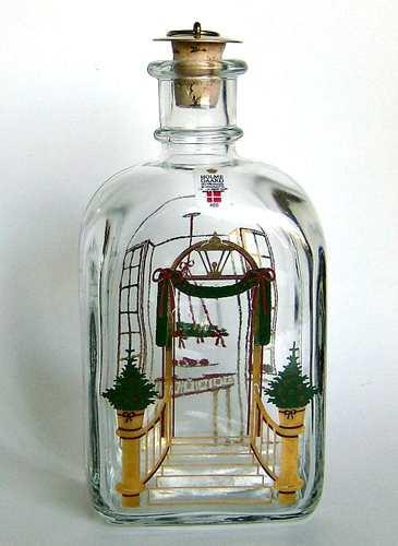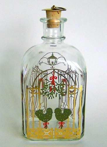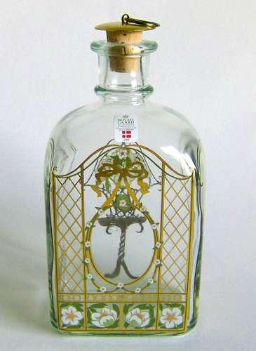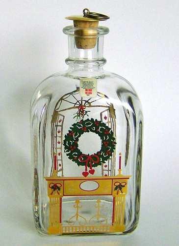 Firkantet karaffel med buet top, lille hals med tilhørende korkprop. Dekoreret med flerfarvet silketryk "Kristtorn krans over kaminen"