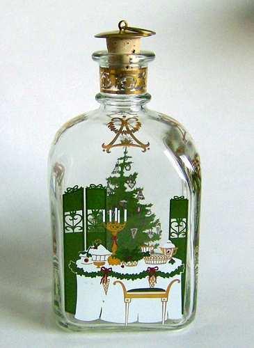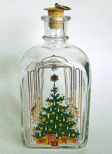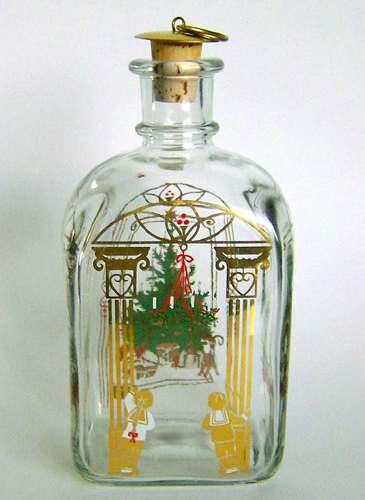 Firkantet karaffel med buet top, lille hals med tilhørende korkprop. Dekoreret med flerfarvet silketryk "Det pyntede juletræ med gaver under"