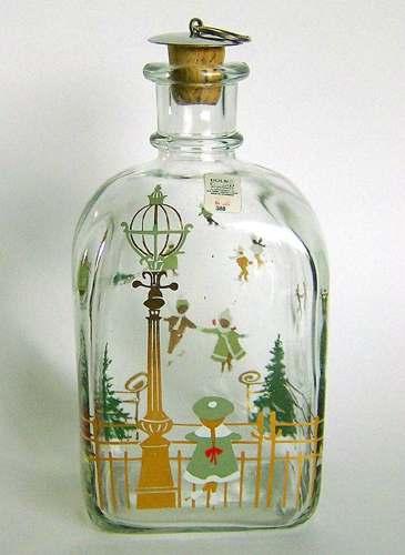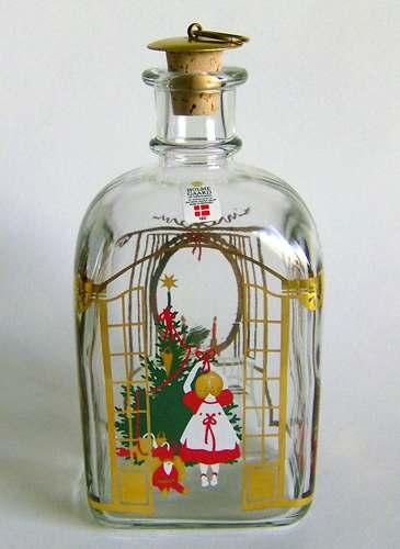 Firkantet karaffel med buet top, lille hals med tilhørende korkprop. Dekoreret med flerfarvet silketryk "Pige pynter juletræ med nisse siddende foran gaverne"