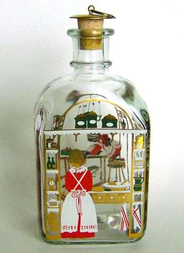 Firkantet karaffel med buet top, lille hals med tilhørende korkprop. Dekoreret med flerfarvet silketryk "Mor bager julekager og børnene leger i baggrunden"