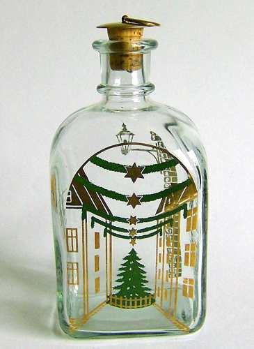 Firkantet karaffel med buet top, lille hals med tilhørende korkprop. Dekoreret med flerfarvet silketryk "Juleudsmykning og juletræ mellem huse"