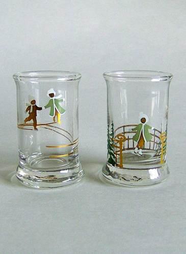 To stk. juledramglas tilhørende juleflasken 1988. Dekoreret med børn der løber på skøjter, i guld og grønne farver.