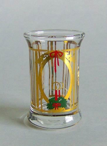 Juledramglas tilhørende juleflasken 1990. Dekoreret med juledekoration og to lys, i guld, rød og grøn farve.