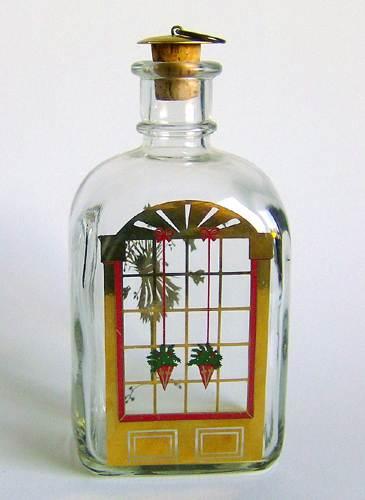 Firkantet karaffel med buet top, lille hals med tilhørende korkprop. Dekoreret med flerfarvet silketryk "Vindue med to julekræmmerhuse, og bagside med juleneg og fugle"