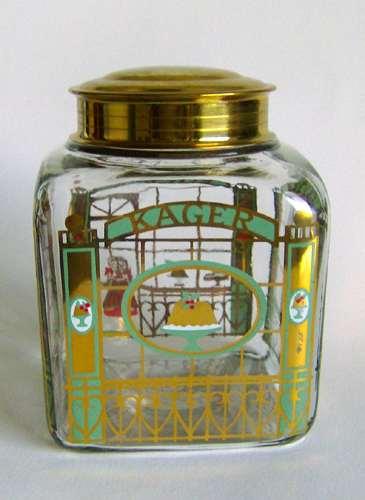 Firkantet opbevaringsglas med skulder og rund åbning, med tilhørende låg i messing. Dekoreret på alle sider med vinduer, kager og teksterne "KAGER" "BISQUITS" "KUCHEN" "COOKIES"
