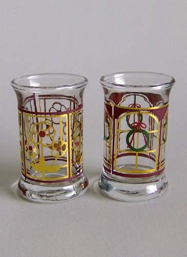 To stk. juledramglas tilhørende juleflasken 1995. Dekoreret med vinduer og blomster, i guld, violetbrun og grøn farve.