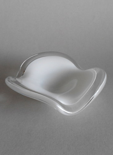 Lille skål/askebæger med bølget rand, blæst i hvidt opalineglas, med klart overfang. Planslebet bund.