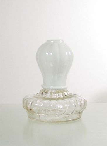Vågelampe, beholder hvidtglas, kuppel hvid, de to dele blæst på halvautomatisk maskine. tekst under bunden "P.J.BOVINGS EFTFL KJØBENHAVN".