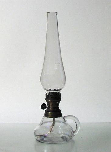 Håndlampe til fladbrænder med påsat hank og mundblæst lampeglas.