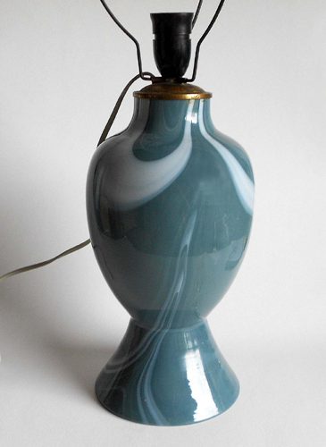 Stor bordlampe blæst i marmoreret blågråt og opalhvidt glas, monteret med messing og fatning.