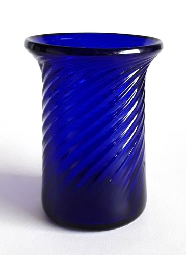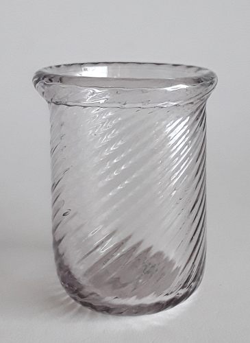 Cylinderformet illuminationsglas med vredet stribet optik, og omlagt rand samt afrundet bund.