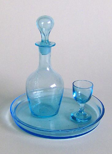 Børnestel, bakke med karaffel og glas. Glasset på glat stilk, med slebet rand, ligesom bakken.