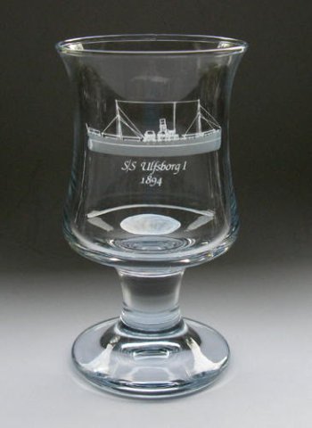 Rødvinsglas fra servicet "Skibsglas" dekoreret med skib og teksten "S/S Ulfsborg I 1894" udført med sandblæsning og påbrændt hvid emalje.