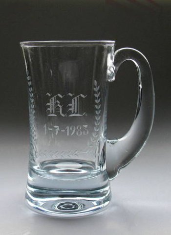 Stort ølkrus fra servicet "Skibsglas" kaldet "Skibshund", med tyk massiv bund og påsat hank. På korpus graveret "K.L. 1-7-1983" omkranset af bladranker.