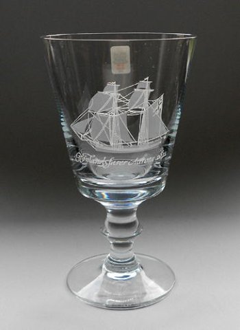 Stort ølglas fra servicet "Wellington". På kummen et skib og teksten "Grønlandsfarer Aurora 1811" udført med sandblæsning og påbrændt hvid emalje. På foden teksten "Handels-og Søfartsmuseet på Kronborg 1986" (Påsat Dannebrogs label med nr. 386)