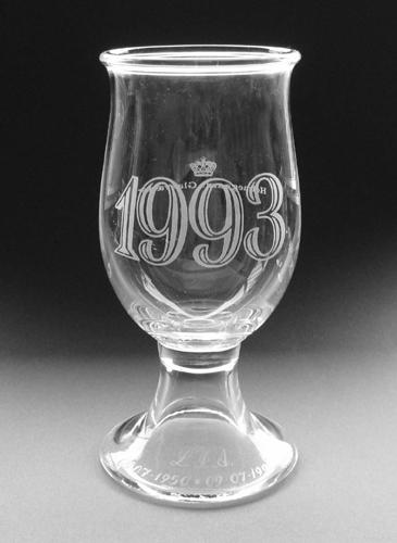 Stor "Perle" ølpokal med graveret årstal "1993". Bag på: Krone over Holmegaards Glasværker.