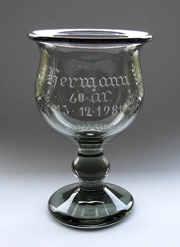 Pokal formet som drikkeglas med stor rund knop på stilken, blæst i smoke farvet glas. På kummen graveret "Hermann 60 år. 13.12.1981" omkranset af bladranker.