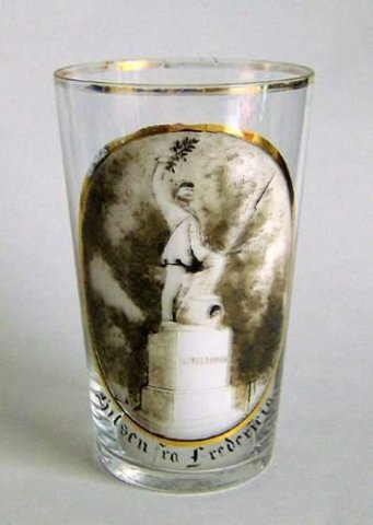 Vandglas, konisk glat med afsprængt plansleben guldbelagt kant, på korpus guldoval med emaljemalet motiv: Landsoldaten i sort/hvid og "Hilsen fra Fredericia"