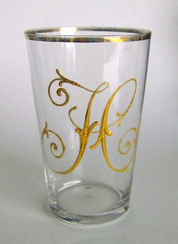 Vandglas, konisk glat med afsprængt guldbelagt rand. På korpus emaljemalet stort "H"