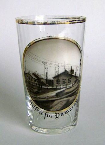 Vandglas, konisk glat med afsprængt plansleben guldbelagt kant, på korpus oval guldramme med emaljemalet motiv: Parti fra Vamdrup i sort/hvid og "Hilsen fra Vamdrup".