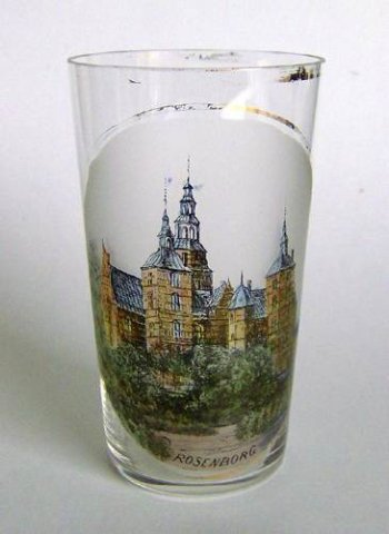Vandglas, konisk glat med afsprængt plansleben guldbelagt kant, på korpus oval guldramme med emaljemalet/trykt motiv: Rosenborg Slot i farver og "ROSENBORG".