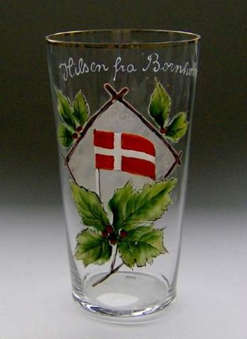 Vandglas, konisk glat med afsprængt plansleben guldbelagt kant, på korpus emaljemalet motiv: Indrammet Dannebrog og blade med påsatte røde bær og "Hilsen fra Bornholm".