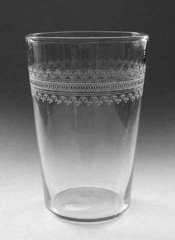 Konisk vandglas med kraftig bund, om kummen matslebet bredt bånd. Anhæftet med sandnavle unden bunden.