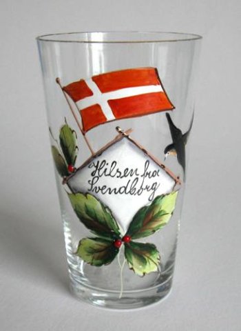Vandglas med konisk kumme, dekoreret med emaljemalet motiv: Kristtorn med påsatte røde bær, Dannebrog, flyvende svale samt felt med teksten "Hilsen fra Svendborg". Afsprængt og planslebet med guldkant.
