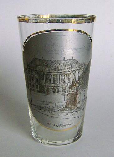 Vandglas, konisk glat med afsprængt plansleben guldbelagt kant, på korpus oval guldramme med trykt motiv: Amalienborg Slot på sølvfarvet baggrund og "AMALIENBORG".