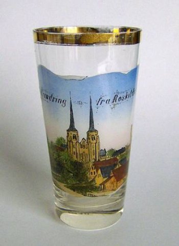 Vandglas, konisk glat med afsprængt plansleben guldbelagt rand, på korpus emaljemalet/trykt motiv: Parti med Roskilde Domkirke i farver og "Erindring fra Roskilde".