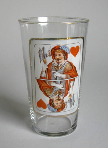 Vandglas, konisk glat med rester af guldkant, på korpus påbrændt overføringsbillede i emalje: Hjerter knægt på hvid baggrund og guldramme.