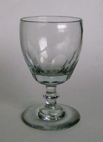 Maderaglas med ægformet kumme med brede olivslibninger, på omvendt balusterformet stilk med skarp mollex. Kuglet i bund.